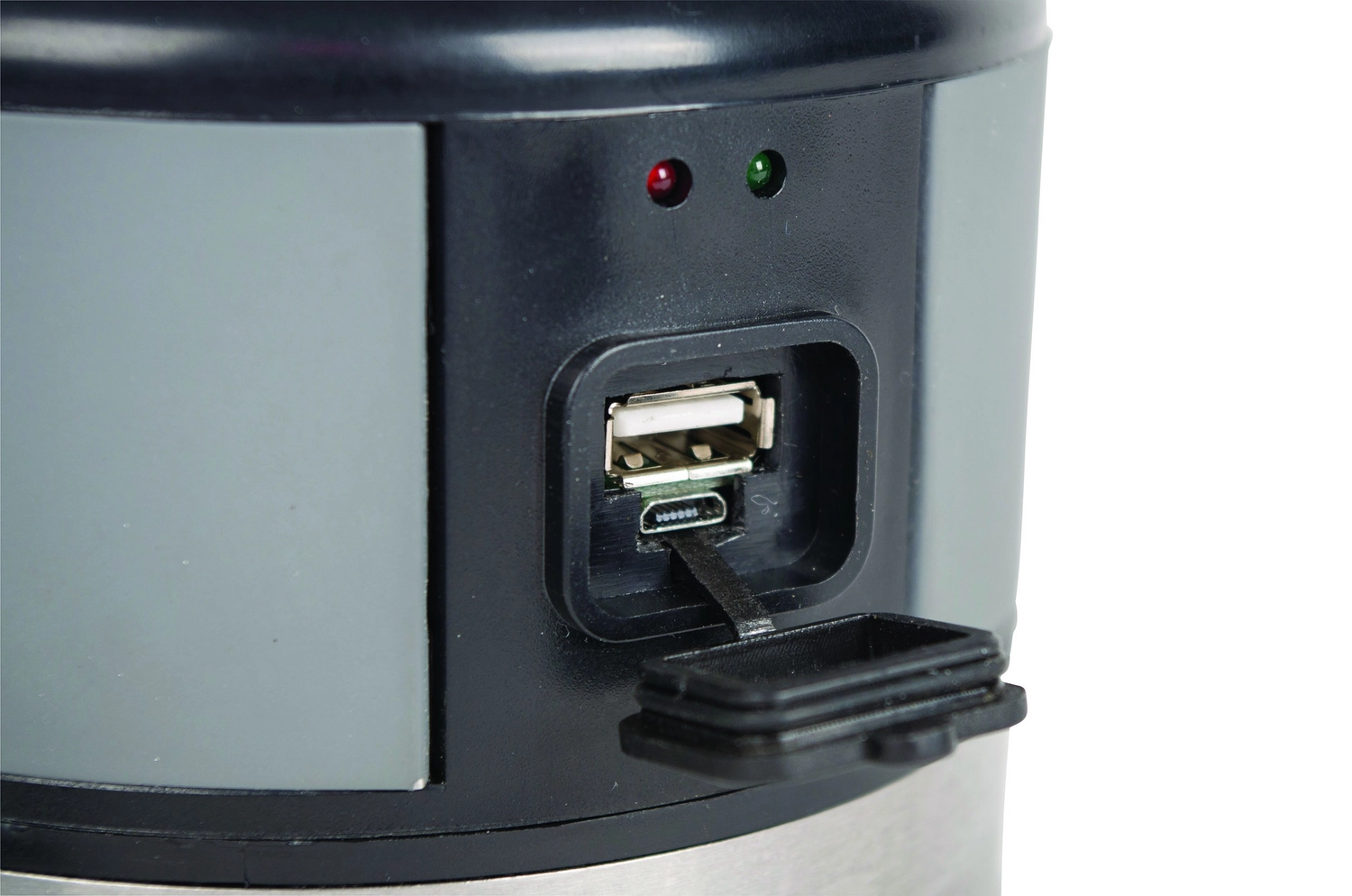 Deze stoere reislantaarn is afkomstig van kwaliteitsmerk Bo-Camp. De lamp verzorgt een aangename belichting door de warme lichtkleuren van de high power LED. De stijlvolle lamp heeft een wit matte kap en een inklapbaar hengsel waar een kompas inzit. Vanwege de ingebouwde Li-ion accu is de reislamp de perfect tafellamp voor op vakantie. Via de bijgeleverde USB kabel is het mogelijk de accu op te laden tot wel 100 uur verlichting. Tevens is het via deze kabel mogelijk om andere apparatuur op te laden.