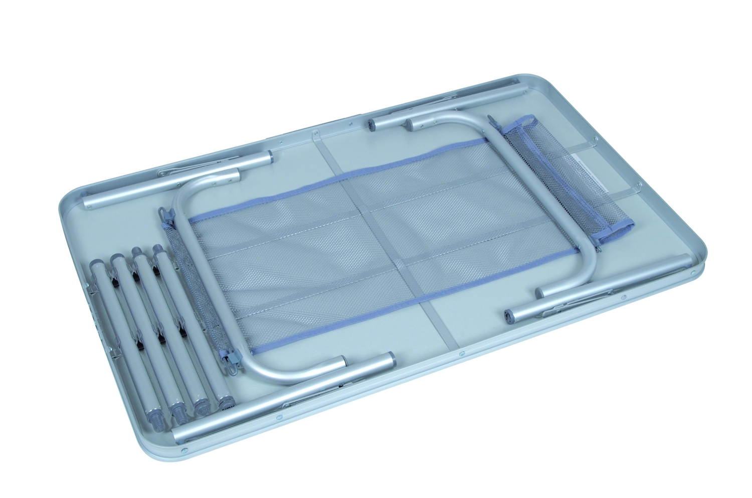 De Bo-Camp tafel is een handige en zeer stabiele tafel die voor veel verschillende doeleinden te gebruiken is. De tafelpoten zijn verstelbaar (36 cm / 70 cm) zodat u een tafel heeft voor elke situatie. De tafelpoten hebben stelschroeven voor de fijnafstelling. De poten zijn tevens afneembaar waardoor de tafel eenvoudig ingeklapt kan worden. Deze tafel is gemaakt van aluminium en daardoor zonder enig probleem mee te nemen, daarna is hij weer binnen enkele seconden terug in elkaar te zetten. Onder het tafelblad is een net bevestigd waar spullen opgeruimd kunnen worden.